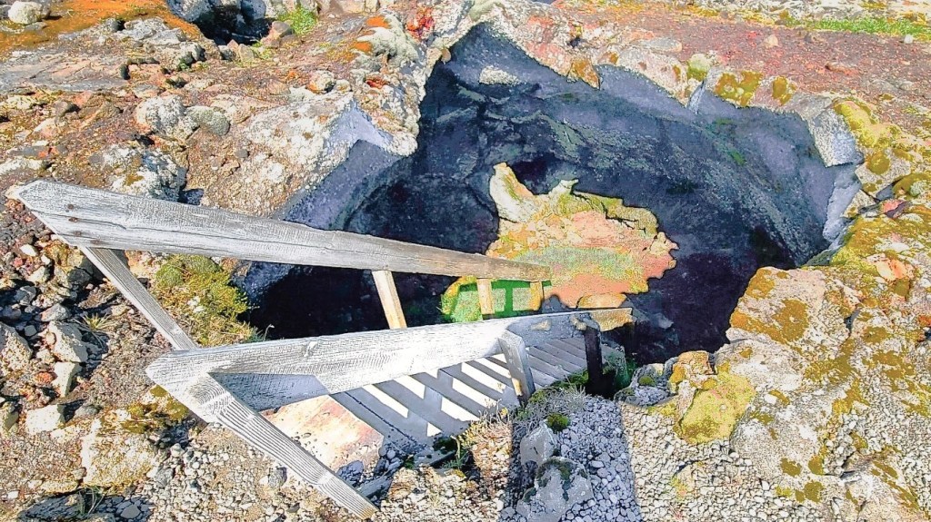 With our tour party now complete, each of us received a hardhat and headlamp, and Siggy (our only true-born Icelandic guide during our trip) led us 100m across a lava field called Hallmundarhraun to a twin opening in the earth where the roof of Víðgelmir had collapsed, revealing the cave’s only entrance.
